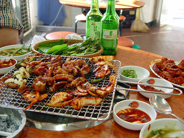 어디가 좋을까, 한참을 고민하며 돌아다니다 우리가 들어선 곳은 꼼장어 집이었다. 생긴 지 얼마 되지 않은 듯, 개업 축하 화환이 출입구를 장식하고 있었다. 꼼장어 2인분과 소주를 시켰다. 숯불이 들어오고 그 위 불판에 자리 잡은 꼼장어가 몸을 비비 꼬았다.