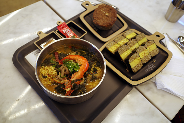 김밥과 라면과 주먹밥을 주문했다. 나는 분식집에 가면 제육 덮밥, 순두부찌개만 먹는 인간이라 셋 다 별로였다. 김밥은 원래 안 좋아하고, 주먹밥 위의 숯불갈비는 식자재 마트에서 벌크로 파는 제품만 못했고 밥 알갱이는 따로 놀고 식감도 별로였다. 라면은 그나마 나았는데, 일부러 찾아와 이 돈 내고 먹을 만한 맛은 아니다.